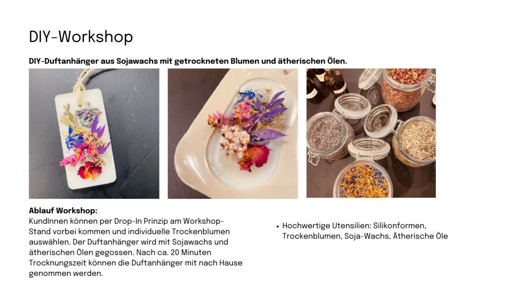 Die Teilnehmer*innen gestalten ihre eigenen Duftanhänger aus reinem Sojawachs, veredelt mit 100% ätherischen Ölen und getrockneten Blüten. Ein natürlicher, dekorativer Duftanhänger – perfekt für Kleiderschränke, Badezimmer, Geschenkboxen oder als kleine Duftdeko.